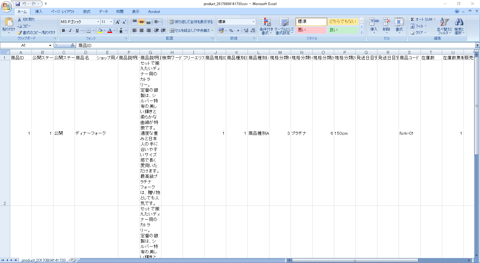 既に登録されている商品のCSVデータを取得すると「product_20170804141733.csv」というような「product_年月日時分秒.csv」のファイル名でダウンロードできます。